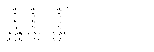 我們知道,傳統電視系統是由行向量H,幀向量V,亮度向量Y組成的三維線性空間的結構。用以下的矩陣來表示: