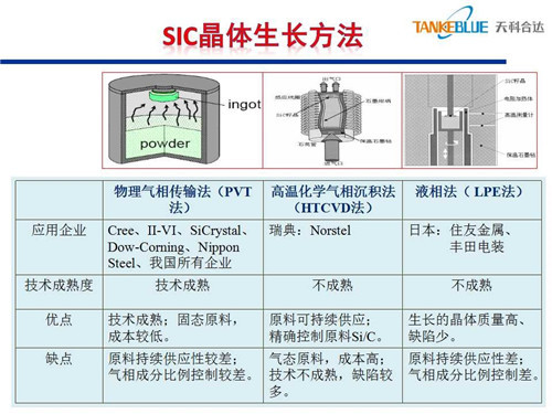 碳化硅襯底的生長方法有三種:一是物理氣相傳輸法,該技術(shù)相對成熟,性價比高;二是高溫化學(xué)氣相沉積法,優(yōu)點(diǎn)是原料可持續(xù)供應(yīng),可精確控制原料中的碳硅比;三是液相法,尚處于研究階段。
