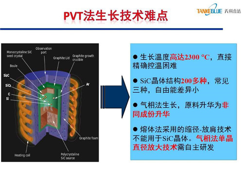 PVT法生長碳化硅存在以下技術(shù)難點(diǎn),一是晶體生長溫度高達(dá)2300℃,直接精確控溫困難;二是很難獲得單一的碳化硅晶體結(jié)構(gòu);三是生長時原料易升華為非同成份其他物質(zhì);四是熔體法采用的縮徑-放肩技術(shù)不適用于氣相法碳化硅晶體生長,氣相法單晶直徑放大技術(shù)需自主研發(fā)。
