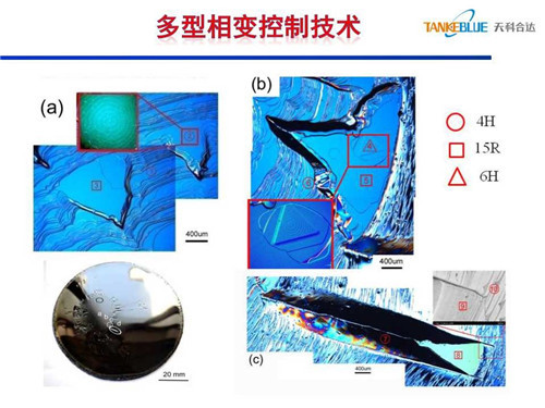 碳化硅晶體生長時如果臺階過寬,晶型沿 [0001] 方向的排列信息反應(yīng)不出來,會在臺階上自發(fā)成核,發(fā)生晶型轉(zhuǎn)變。研究發(fā)現(xiàn),當(dāng)晶體表面不光滑、不平整時,易發(fā)生多型相變,4H會發(fā)生6H和15R相變。另一方面晶型轉(zhuǎn)變與生長室氣氛相關(guān),通過控制生長室氣氛解決了多型相變技術(shù)。