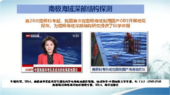 在南極地區,我國有二處陸上地震臺站。在第28次南極科考時投放了海底地震儀,過了一年,在第29次南極科考船去那片海域回收時,因那片海域結冰,沒法回收。根據設計,海底地震儀最大留海時間為一年,大家都擔心失掉這兩臺儀器了??上驳氖牵诌^了一年那片海域已經沒有冰了,在回收時,海底地震儀竟然浮到海面,這是在海底記錄時間最長的一次試驗。也為南極海域深部結構研究提供了科學依據。