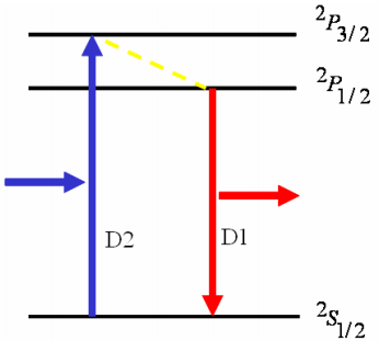 半導體泵浦堿金屬蒸氣激光器(DPAL,Diode Pumped Alkali vapor Laser),是由半導體激光器(LD,Laser Diode)作為泵浦源,堿金屬飽和蒸氣作為激光的增益介質以實現高功率的激光輸出。堿金屬元素包括鋰(Li),鈉(Na),鉀(K),銣(Rb),銫(Cs),它們最外層只有一個價電子,表現出相似的能級結構如圖2-6所示。2S1/2為基態能級,2P1/2和2P3/2為自旋-軌道相互作用而劈裂的激發態能級,其中2P1/2 → 2S1/2躍遷對應D1譜線,稱為激光躍遷;2S1/2 → 2P3/2躍遷對應D2譜線,稱為抽運躍遷,對堿金屬蒸氣進行抽運就是要實現2S1/2和2P1/2能級之間的粒子數反轉。