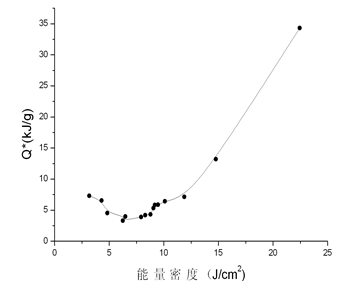 如圖3-5所示,單位面積除漆質量先是隨著能量密度上升,在能量密度為6~8 J/cm2之間達到峰值,隨后下降。當激光能量密度大于12 J/cm2后,單位面積除漆質量顯著下降,此時,激光與樣品表面的作用機理可能已發生突變。而進一步分析Q*值(Q*=激光能量密度/單位面積除漆質量)隨能量密度的變化曲線,如圖3-6所示??梢钥闯?,當能量密度大于10 J/cm2后,Q*值隨著激光能量密度的提高大幅提高,說明激光能量的利用效率顯著下降。且在入射激光能量密度為6.5 J/cm2時,Q*值為極小值,約為3 kJ/g。