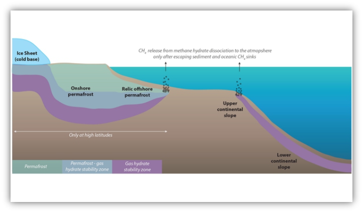 全球變暖,海洋中,深度在2000米以內(nèi)的海水升溫,將導(dǎo)致在陸坡上存在的可燃冰(固態(tài)甲烷水合物)釋放,空氣中的甲烷會迅速氧化成二氧化碳,使二氧化碳濃度急劇增加。