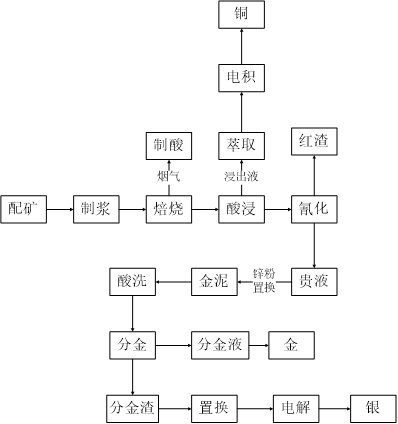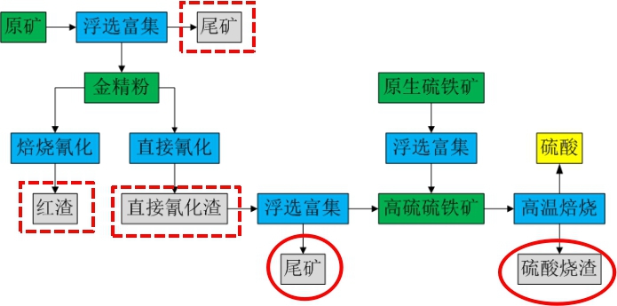 黃金生產過程的固廢包括浮選尾礦、氰化渣(紅渣和直接氰化渣)(圖3)??蓪鹁V的浮選尾礦進行氰化提金或制造建材,對直接氰化渣進行浮選回收有價元素。