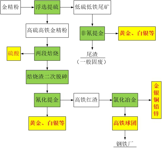 我們提出了黃金未來發展的一個思路。黃金綠色選冶技術包括以下三個部分:難選冶金精粉硫鐵富集選、兩段焙燒?氰化提金(含焙燒渣二次脫砷)、高鐵紅渣高值化綜合利用、尾礦非氰提金。終端產品包括金、銀等貴金屬、硫酸、銅、高品質煉鋼粒鐵(球團)等。該流程產業鏈結構完整,實現真正意義上的資源循環利用;綜合回收礦物中的金、銀、銅、鉛、鋅等有色金屬和鐵,各有價元素的資源化利用得到最大化,避免了資源浪費;實現了氰化尾渣的無害化利用,整個過程沒有危險固廢產生,廢氣達標排放,水循環使用無外排;能夠處理多元素含砷復雜金精礦,對原料的適用性強(圖4)。