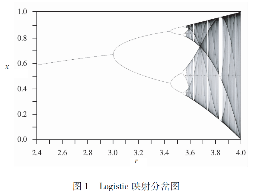 首先給大家介紹一下非線性動力學(xué)的基本概念。考慮到在座的大多是等離子體方面的專家,對非線性動力學(xué)不太熟悉,因此我就從最簡單的離散映射系統(tǒng)開始為大家進(jìn)行介紹。這個映射系統(tǒng)雖然看起來非常簡單,但足以讓大家比較好地理解非線性動力學(xué)的基本概念。Logistic映射數(shù)學(xué)表達(dá)式是xn+1=rxn(1-xn),它是非線性動力學(xué)里非?;A(chǔ)的一個例子。盡管Logistic映射看起來很簡單,但它已經(jīng)是一個動力學(xué)系統(tǒng),即它的狀態(tài)變量是隨時間演化的。對于我們現(xiàn)在討論的Logistic映射,比如說第n步是xn,那第n+1步是什么呢?很簡單,由映射關(guān)系就可以得到xn+1。我們來觀察它隨時間會如何演化,比如說從x0開始,迭代第一步得到x1,再得到x2,一直迭代下去我們最終可以觀察到映射的穩(wěn)態(tài)結(jié)果,那我們究竟可以觀察到什么樣的穩(wěn)態(tài)行為呢?這其實(shí)就是非線性動力學(xué)研究的一個主要內(nèi)容。我們來看這么一個簡單的Logistic映射,圖1給出了它的分岔圖。顯然,映射最終的穩(wěn)態(tài)行為是與映射的參數(shù)有關(guān)系的,通過圖1的分岔圖我們就可以觀察映射在各個參數(shù)下的穩(wěn)態(tài)行為。