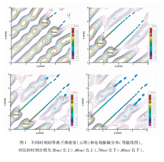 下面看一下相交微波束大氣擊穿的模擬結(jié)果,我們首先算了同頻率微波相交的情況,此時相干疊加之后,由于干涉作用,會形成電場強(qiáng)度強(qiáng)弱分布。我們首先模擬一下種子電子在弱場區(qū)的情況。因?yàn)樵诖髿庵蟹N子電子是偶然出現(xiàn)的,有可能出現(xiàn)弱場區(qū),如果出現(xiàn)在弱場區(qū),它需要擴(kuò)散,擴(kuò)散到強(qiáng)場區(qū)之后電子碰撞分子發(fā)生雪崩電離,形成的等離子體沿著強(qiáng)場區(qū)做趨源運(yùn)動,運(yùn)動方向沿著)=:的這條線。形成的等離子體的區(qū)域是一個等離子體絲帶,當(dāng)然如果把氣壓降低,會發(fā)現(xiàn)絲帶就會過渡為一個等離子體帶。圖1給了幾個典型時刻的等離子體密度分布和場強(qiáng)的分布,在20ns的時候,由于靠近等離子體區(qū)域最強(qiáng)的場是沿著)=:這條線的,當(dāng)?shù)入x子體絲帶長度增加到一定程度的時候,在其左上和右下區(qū)域,相當(dāng)于把兩個微波場隔開,這兩個區(qū)域相當(dāng)于只有一個單微波的作用,在兩邊有新的等離子體絲帶。如果初始電子出現(xiàn)在強(qiáng)場區(qū),電子碰撞分子就會雪崩電離,形成等離子體。等離子體區(qū)域也是沿著J=:這條線做趨源運(yùn)動。下面簡單比較了同頻和非同頻微波相交的大氣擊穿,同頻相當(dāng)于相干疊加,非同頻相當(dāng)于非相干疊加,模擬時間都是80ns,初始的種子電子數(shù)都一樣,可以發(fā)現(xiàn)在相干的情況下,即使把種子電子源放到場強(qiáng)最小的地方,產(chǎn)生等離子體的區(qū)域也大于非相干的情況,而且產(chǎn)生的最大電子數(shù)也是大于非相干的情況。總結(jié)主要有三點(diǎn),一個是區(qū)域隨壓強(qiáng)的變化,還有等離子體做趨源運(yùn)動,還有相干比非相干的等離子體區(qū)域比較大。