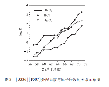 [A336 ] [ P507]對稀土離子的萃取趨勢是隨著原子系數增加分配系數增大,如圖3所示。不同酸性條件下的相對分配系數關系順序:HN03 > HCl >H2SO4,與酸根離子的水化能ΔG順序一致,硝酸根的水化能最低(ΔGO=-314kJ/mol),硫酸根水化能最高(ΔGO =-1103 kJ/mol )。