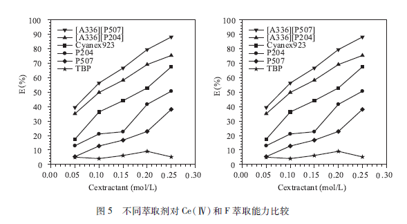 離子液體萃取劑應用于H2SO4、體系中萃取鈰( IV)和氟,鈰( IV)與氟以CeF3+絡合,形成CeF ( HSO4 ) ( SO4 )2· [ A336 ] [P507 ]萃合物。分離鈰( IV),牡和稀土的順序:鈰( IV)>牡(W)>稀土(III ) o萃取劑的萃取能力比較順序:[A336 ] [ P507>Cyanex923 > TBP。對氟的萃取能力有相似的趨勢,其結果見圖5。我國輕稀土礦含有近50%的缽,將缽(W)與稀土(111)分離,可以大大減少稀土萃取分離的壓槽量,縮短分離流程,降低成本。