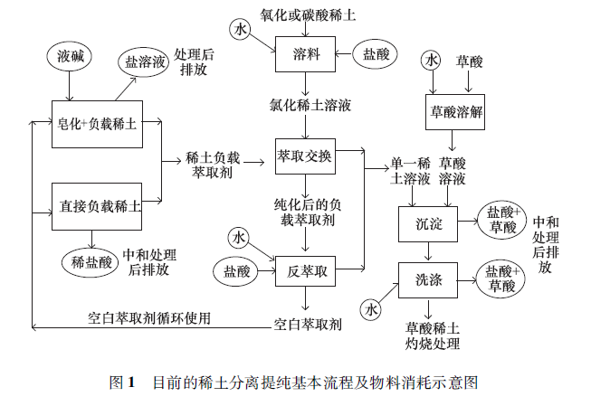 從目前的稀土分離基本工業流程,不難注意到,各段工藝間相對獨立,過程中消耗酸堿等化工原料和水,最終處理后作為廢水排放。以中憶富鋪稀土原料分離為例,典型試劑消耗如表1,每分離提純1噸稀土氧化物,消耗10噸左右的鹽酸、2. 4噸燒堿等化工材料,產生85噸廢水,其中含鹽量6. 8噸。