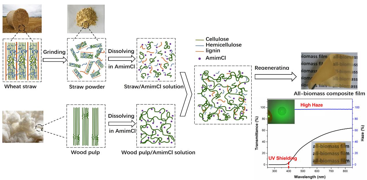 第一個是玉米秸稈直接溶解,保留里面的納米晶體結構得到半透明的膜,強度可以做到50 MPa(圖3);第二個是以小麥秸稈為原料,將少量高聚合度的纖維素與小麥秸稈粉末共混后做膜,膜強度也大于50 MPa,這是一個非常實用的方法,加少量的高聚合度纖維素就可以將低品質的纖維素變成一個可以用的材料(圖4)。