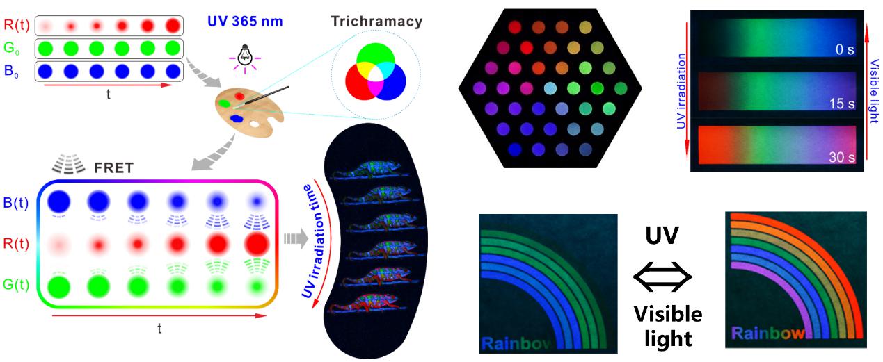 比如發光的防偽材料,利用纖維素均相可控反應的優勢,把原來容易聚在一起的熒光分子,通過化學方法鍵合到纖維素上,克服了溶液狀態下聚集誘導淬滅效應,將其制成固態熒光材料,同時它仍然具有高分子的可打印、可噴涂的特點,將不同的發光基團接到不同的纖維素上可以得到不同的顏色,將紅、綠和藍三種顏色的纖維素衍生物共混,利用三基色原理,還可以做打印的動態熒光材料(圖5)。