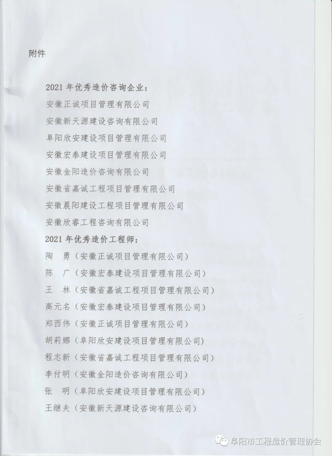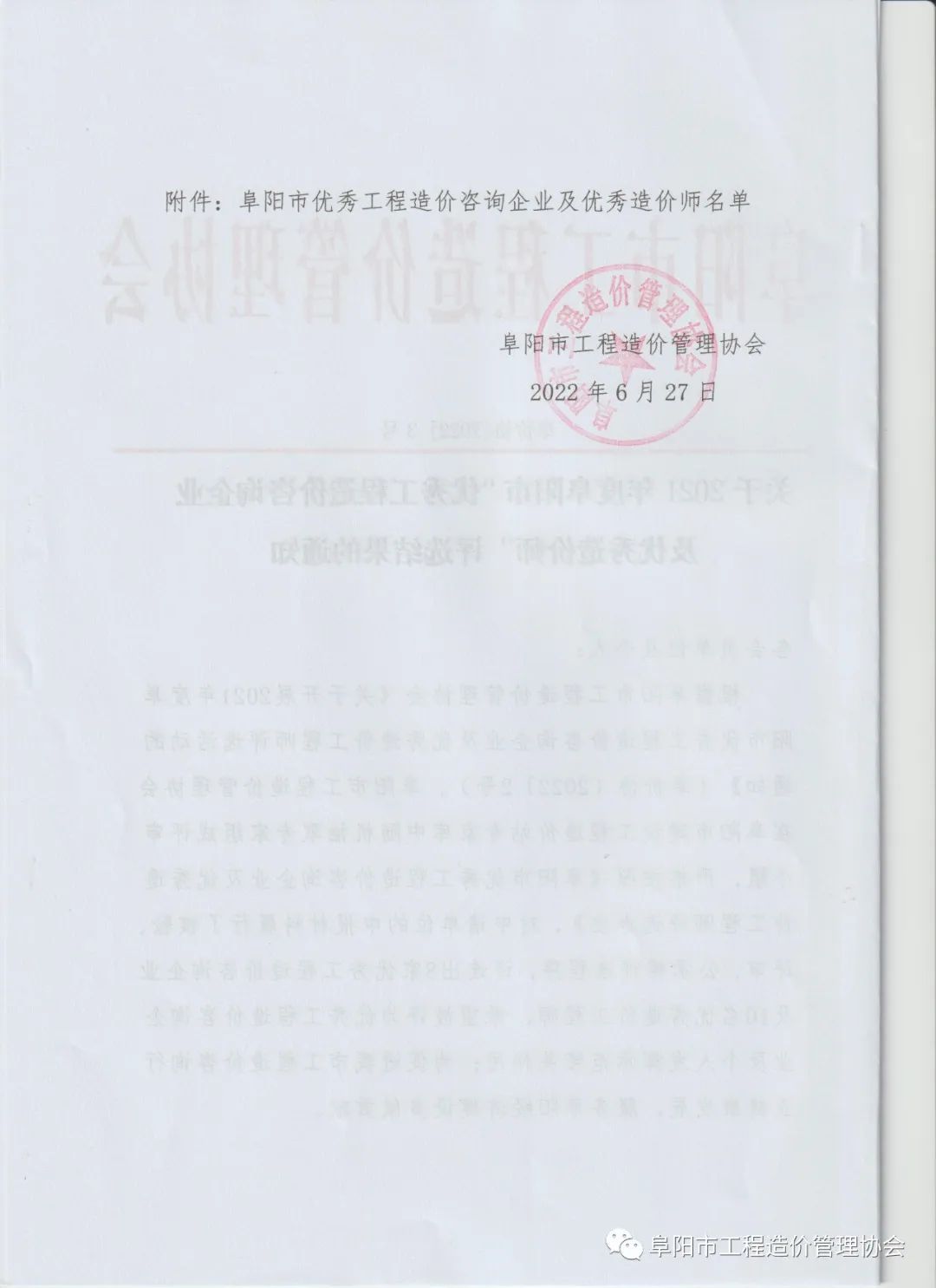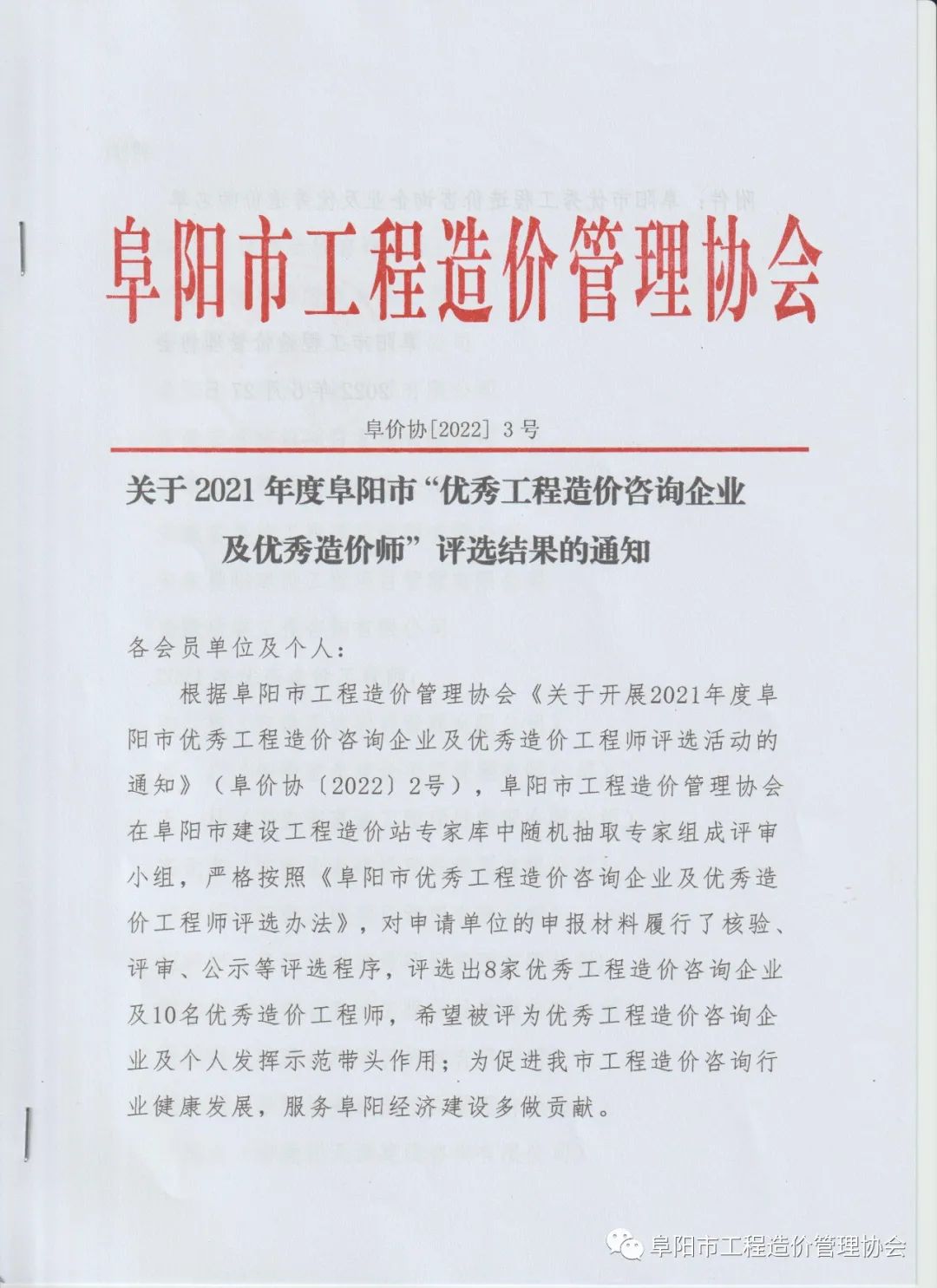 - 關于2021年度阜陽市“優秀工程造價咨詢企業及優秀造價師”評選結果的通知